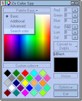 Además el programita nos da el color en una variedad tal de modos que sorprende: códigos hexadecimales para HTML, valores RGB, CMYK y HLS (un modo de color que no es hoy en día muy utilizado, lo que no extraña dada la antigüedad de Zx Color Spy). Pero la cosa no acaba aquí: también nos va a dar el código para sistemas de programación como Delphi, Visual C, Visual Basic y Access. Casi nada. ¡Y todo en un archivo ejecutable de menos de 300 kb!